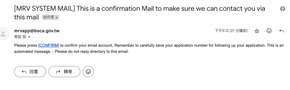 - 檢查電子郵件,點擊來自「mrvapp@boca.gov.tw」的確認連結,輸入護照號碼登入系統。